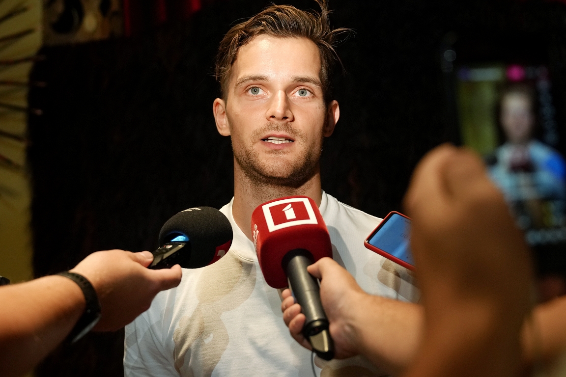 Latvijas vīriešu hokeja izlasei mača ievadā pret amerikāņiem izdevās turēties līdzi pretiniekiem, sarunā ar aģentūru LETA teica Latvijas valstsvienības uzbrucējs Teodors Bļugers.